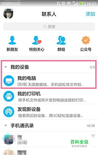 打开手机QQ,登录账号,点击屏幕下方的联系人--我的设备--我的电脑,同时在电脑上也要把QQ登陆上。