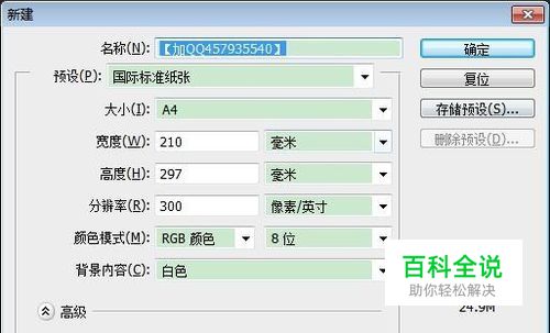 新建文件,大小选择A4,分辨率选择300像素/英寸