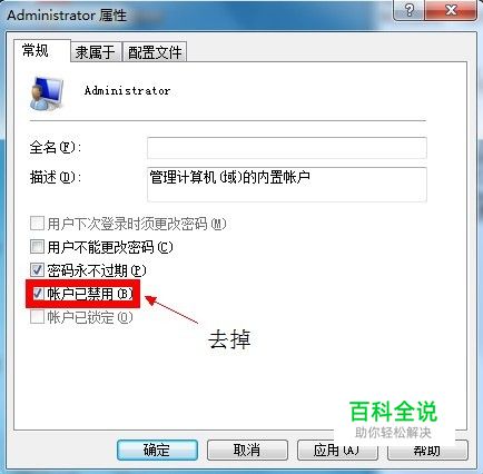 显示“Administrator 属性”的界面,在“常规”选项卡下,将“账户已禁用”的勾去掉