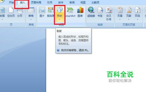 打开word,在工具栏中找到插入选项卡,点击进入,然后在工具栏内找到形状图标,我们插入形状就是要用到这个工具