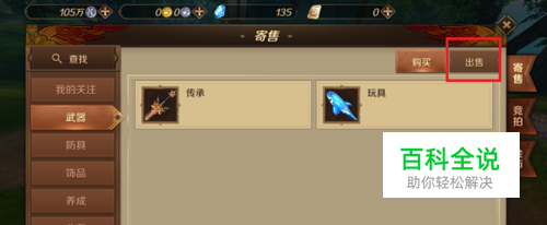 第二步进去交易行界面之后,首先我们可以寄售物品,点击出售,如下图所示: