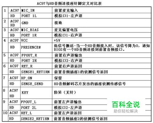 连接座的针脚分配: 针 信号名 说明 1 AUD_MIC_IN 前置麦克输入。 2 AUD_GND 供模拟音频电路使用的接地。 3 AUD_MIC_BIAS 麦克偏置电压。 4 AUD_VCC 供模拟音频电路使用的滤波 +5 V。 5 AUD_FPOUT_R 输出给前置的右声道音频信号。 6 AUD_RET_R 从前置返回的右声道音频信号。 7 HP_ON 为以后控制耳机放大器保留。 8 KEY 无针脚。 9 AUD_FPOUT_L 输出给前置的左声道音频信号。 10 AUD_RET_L 从前置返回的左声道音频信号。 连接座的跳线: 如果前置音频接线没有连接到主板的前置音频连接座上,连接座的5和6,9和10针应当用跳线短接, 否则后置音频插座无效。 机箱前置音频插座和连接线 现在看看实际的机箱前置音频插座和连接线。符合AC97标准的前置音频面板如下图:从上图可以看到符合AC97标准的音频接线有7根: 1 AUD_MIC_IN 前置麦克输入。 2 AUD_GND 供模拟音频电路使用的接地。 3 AUD_MIC_BIAS 麦克偏置电压。 5 AUD_FPOUT_R 输出给前置的右声道音频信号。 6 AUD_RET_R 从前置返回的右声道音频信号。 9 AUD_FPOUT_L 输出给前置的左声道音频信号。 10 AUD_RET_L 从前置返回的左声道音频信号。 这7根线与主板的音频连接座连接方式如下图:还有简化的AC97标准的前置音频面板、插座和接线。主要是简化了耳机插座的开关线。 就是说把开关型耳机插座简化为非开关型。连接线为5根,但与主板音频连接座的插针还是7根。如下图:从上图可以看到简化的音频接线有5根: 1 AUD_MIC_IN 前置麦克输入。 2 AUD_GND 供模拟音频电路使用的接地。 3 AUD_MIC_BIAS 麦克偏置电压。 5 AUD_FPOUT_R 输出给前置的右声道音频信号。 9 AUD_FPOUT_L 输出给前置的左声道音频信号。 这5根线与主板的音频连接座连接方式如下图:这种简化的音频输出有一个优点,就是前后置音频输出可以同时使用。标准的四线音频接线, 由于利用开关型插座的开关功能,当前置插座没有插入耳机(音箱)插头时,开关接在后置音频输出插座,可以使用后置音频输出。当前置插座插入耳机(音箱)插头时,开关就把后置音频输出插座断开,使音频输出连接在前置输出插座,后置就没有输出音频,所以前后置音频输出不能同时使用。 这种简化的音频输出通过插针把5/6 9/10短接,使CODEC的音频输出同时连接到前后置音频输出插座上,所以前后置音频输出可以同时使用。