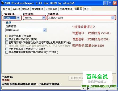 首先准备好要刷机的工具:版本软件,数据线(PCB133LBC) 刷机工具: SGH FlasherDumper0.67dev04091) 选择 设置项进入. 设置COM端口:先看看线是查看端口“几”,就选“几”(我用的是 COM1) 设置COM速率:看看电脑支持的速率,建议用115200。 (我用的是46080) 选择手机型号: 这里选择三星SGH-E330