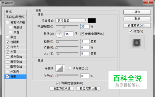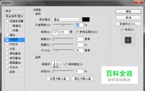 图层样式 接下来,我们要对纽扣的“身体”运用图层样式。图层样式的使用,靠的是不断的尝试,而每一次的运用都要当做一次积累,才能更好的理解和掌握它。那么,今天我们要用到哪些样式呢? 由于要让纽扣变得立体,因此我们可以尝试用一下内阴影。在此过程中,你的大脑中一定要出现一副作品完成后你想要达到的效果,在你不断对其进行调试中你才有可能逐渐接近你的目标。 这是我的面板数值,以及在此数值下的图层效果。