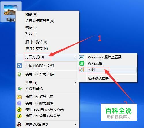 选定图片,然后右击,在出现的栏目选项中,选择“打开方式”,然后在新出现的栏目框中选择“画图”,如下图所示
