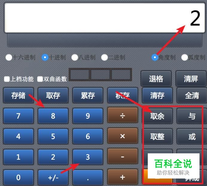 科学计算器的右边是一些逻辑运算的按钮,比如与非或,取余运算。以取余运算为例,和普通运算用法一样,先按数字,比如8,再按运算符‘取余’,最后按数字3,按=号后就得到结果2了。8除3的余数就是2了。