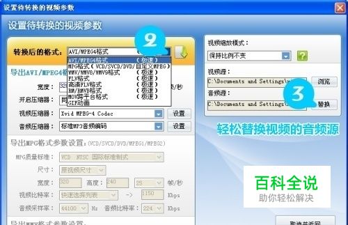 灵活选择需要导出的视频格式。 我们可以在下图标签2处选择我们需要导出的视频格式,根据自身需要进行选择即可。如果要将视频文件上传到网上建议导出FLV格式。 同时,我们点击标签3-“替换”按钮可以导入自己喜欢的音乐文件,将其替换成视频的背景音乐,一键就能完成音频替换操作哦~