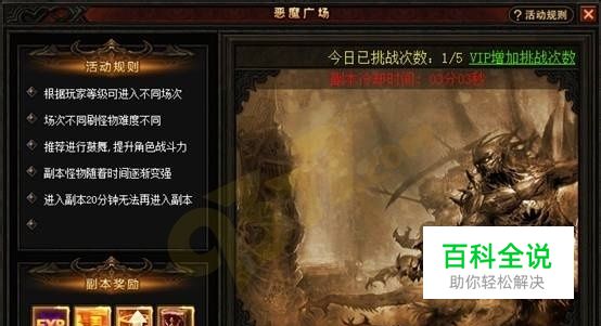 【活动时间】:任意时间【参与条件】:角色等级达到30级【活动入口】:【活动规则】:1、每天可挑战奇迹来了恶魔广场3次,VIP5和VIP8分别各增加1次。2、恶魔广场按等级段分,有30-80、81-130、131-180、181-230、231-280、281-330、331-400共7个场次,场次等级越高,难度越大。按角色等级,自动进入对应等级的场次。3、每次挑战时间只有10分钟,10分钟后会结束自动传送出地图。4、共有4波怪物,杀怪越多,获得经验越多,建议一开始就直接鼓舞提升攻击力。5、在地图中,可以花费金币或元宝进行祝福提升攻击力和生命,最高可以增加100%攻击力。【活动奖励】:海量经验