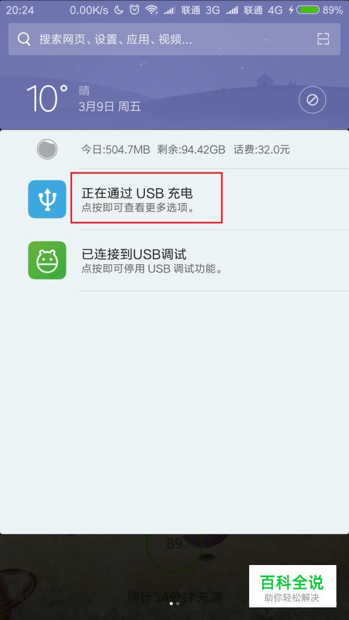 首先,我们使用USB数据线连接手机和电脑,点击手机弹出的USB选项设置按钮。
