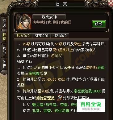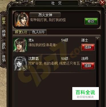 玩家在游戏界面当中可以通过好友图标进行打开社交界面(也可以通过快捷键F进行打开),好友界面分为几个栏目:好友、师徒、战队、伴侣。好友界面主要有显示好友及仇人的情况和可以进行相关的查询功能、聊天等等功能。师徒界面主要显示玩家所拜师的情况或是所收徒的一些具体情况。战队界面主要显示结交好的的情况。伴侣界面主要显示与自身伴侣的一些情况。