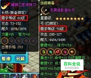 对比一:等级对比 装备等级起的作用非常重要,装备的等级越高增加的属性越多,所以随着玩家等级的提高就要不断的更新身上的装备,高级的装备不仅属性极强外形也更加张扬,也是玩家地位的象征。高级装备都有着等级限制,玩家自身要有一定的实力才能发挥出武器的全部能力。
