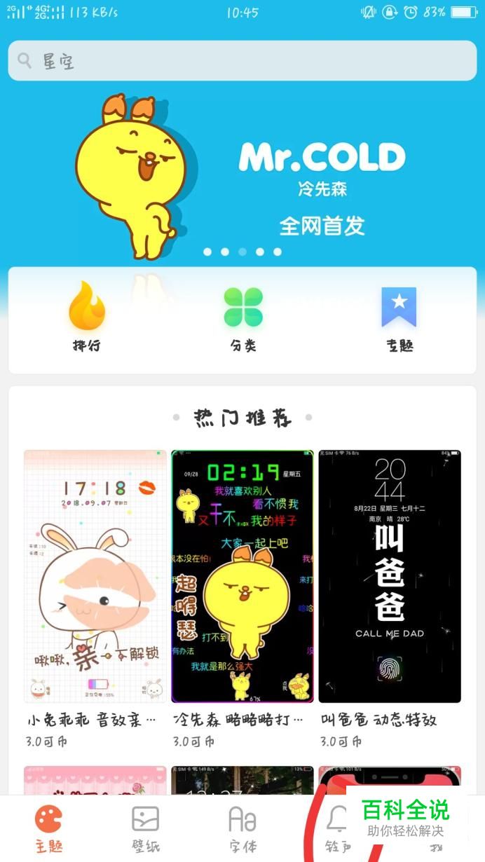 进入主题商店之后,点击屏幕下方的第四个选项“铃声”即可。