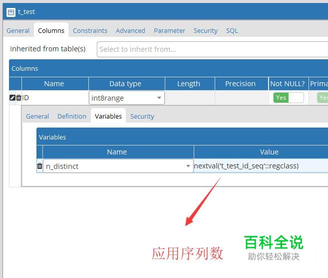最后在字段的编辑界面中切换到Variables选项卡,然后在Value列中通过nextval函数带入刚才定义的序列数即可,如下图所示
