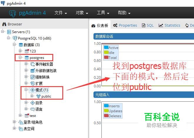 首先打开pgAdmin4,展开postgresql数据库,找到模式下面的public选项,如下图所示
