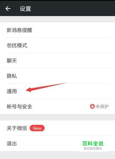 我们进入到微信“设置”后点击“通用”按钮(如图红色箭头所指)