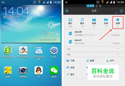 如下图所示:先打开ES文件浏览器,在主界面点击已安装的“应用” .