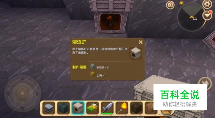 首先我们需要制作一个熔炼炉,之后需要用到。熔炼炉是由岩石块和土块制作而成的。