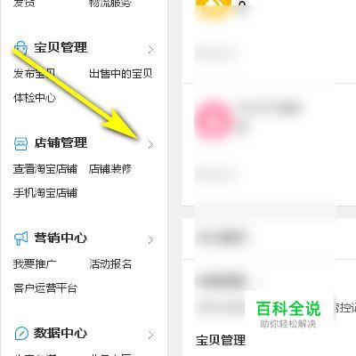 在这页面左侧这里,找到店铺管理;再把鼠标放在右侧的>按钮这里。即时弹出子菜单;再点:宝贝分类管理