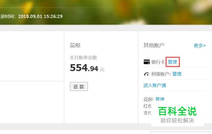 弹出的界面,我们可以看到很多银行卡,我们点击其中一张银行卡中的管理;
