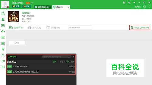 2、选择游戏:在新 浪页 游 助 手中搜索游戏“超神战队”,辅助随页面一起弹出,接下来可以进行平台选择,没有显示的平台可以自定义开启,所有超神战队的都可以使用脚本来玩哦。