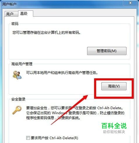在高级选项卡,选择高级用户管理--高级,如下图所示