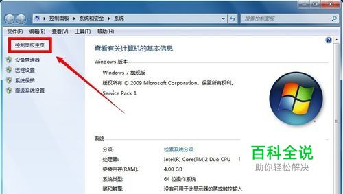 在属性界面选择控制面板主页,如下图所示
