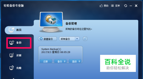 使用《轻松备份》免费软件,备份、还原系统到系统盘的方法 第一步:下载、安装《轻松备份》免费软件(略)。 第二步:备份Windows10系统。 启动轻松备份程序,点击窗口左侧的【备份】(本机备份过一次系统);