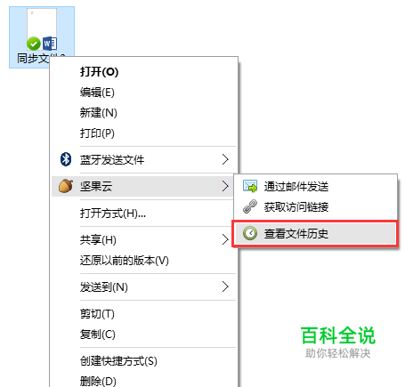 选择您电脑中同步文件夹中需要查看历史版本的文件,点击右键,在右键菜单中选择【坚果云】-【查看文件历史】。