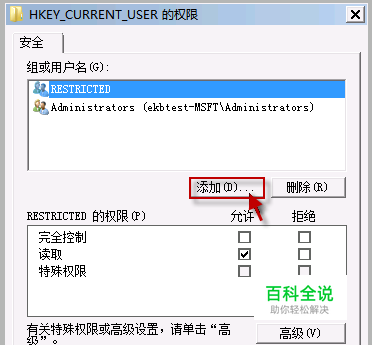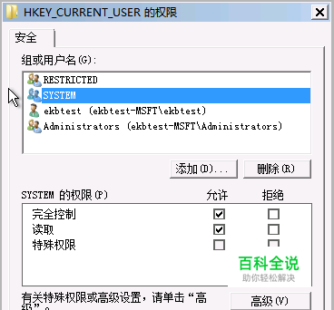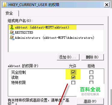 回到权限窗口,现在“组或用户名”中会多出一个用户 ekbtest,并且默认处于选中状态。单击勾选权限栏“完全控制”后面的复选框,然后按“确定”保存设置。