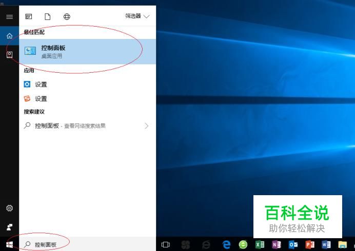 如图所示,搜索框输入"控制面板"。Cortana(小娜)显示搜索结果,点击"最佳匹配→控制面板"项。