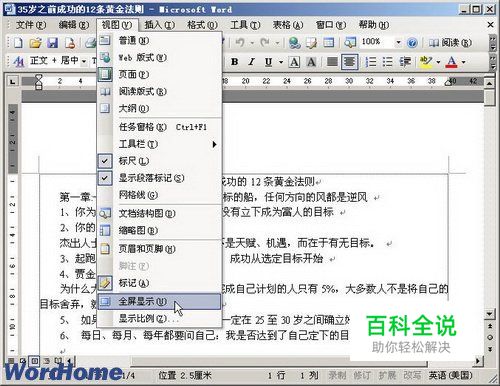 怎样在Word2003中打开和关闭“全屏显示”视图