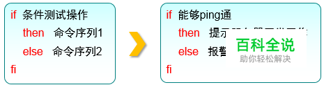 双分支的if条件语句结构,这种结构仅用if、then、else、fi关键词组成,进行两次条件判断匹配,两次判断中任何一项匹配成功后都会执行预设命令,相当于口语的“如果……那么……或者……那么……”,也是属于很简单的一种条件判断结构,操作语法如图所示: 使用双分支的if条件语句来验证某个主机是否在线,然后根据判断执行返回值结果分别给予对方主机是在线还是不在线的提示信息。脚本中我主要是使用ping命令来测试与对方主机的网络联通性,而linux系统中的ping命令不像windows系统一样仅会尝试四次就结束,因此为了避免用户等待时间过长,而通过-c参数来规定尝试的次数,-i参数定义每个数据包的发送间隔时间以及-W参数定义最长的等待超时时间。 [root@linuxprobe ~]# vim chkhost.sh #! /bin/bash ping -c 3 -i 0.2 -W 3 $1 &> /dev/null if [ $? -eq 0 ] then echo "Host $1 is On-line." else echo "Host $1 is Off-line." fi