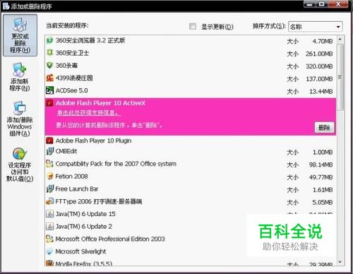 首先大家先下载本文最下面的旧版软件,然后再关闭所有IE浏览器。接着把最新版10.1给卸除掉,并且安装旧版的版本。具体步骤为:我的电脑--控制面板--添加或删除程序如图,卸除以下软件。