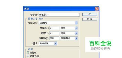 01、按Ctrl+N,在弹出的新建对话框中设置宽度为3CM,高度为3CM,模式为RGB,分辨率为300像素/英寸,单击确按钮,创建一个新图像文件。