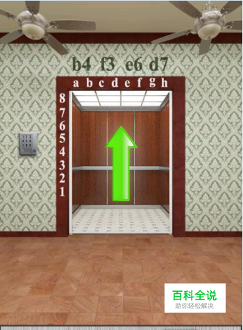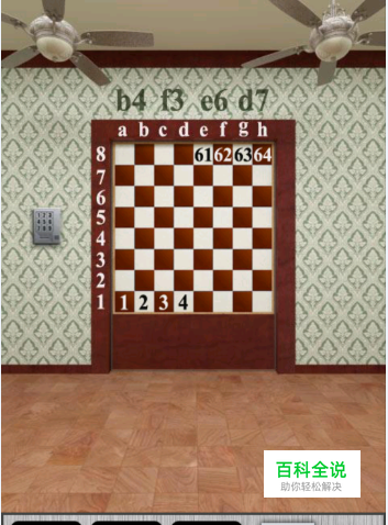 根据据大门中出现的数字,得出8个数字在每一行,门上方提示写着b4 f3 e6 d7,再对应得大门上的符号得出b4=26 f3=22 e6=45 d7=52,得出密码26224552,点击密码器输入密码,门开走人!!