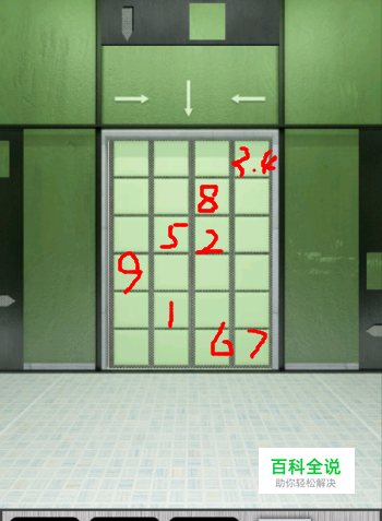 门上有3个九宫格,每个九宫格上都有绿色点,再根据门下的提示1-9得,把手机反过来看得出: 第一个九宫格的绿点代表的是579 第二个九宫格的绿点代表的是1359 第三个九宫格的绿点代表的是359 那么密码就是5791359359 点击密码器输入密码,门开走人!!