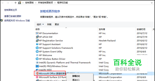 在卸载或更改程序列表中找到预装的Office 2016家庭和学生版程序,右键选择卸载