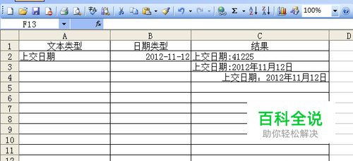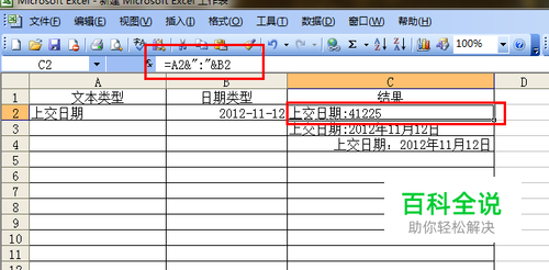 Excel中将分别包含文本和日期的单元格内容合并到一个单元格内,如A1单元格中包含文本“上交日期”,A2单元格中为日期“2012-11-12”,要在另一个单元格中显示:“上交日期:2012年11月12日”。