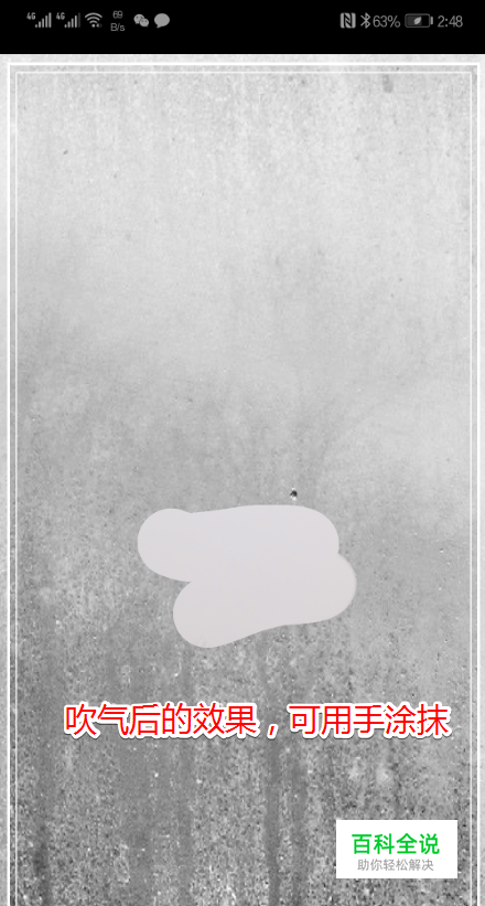 打开后,对着手机的麦克风吹起。手机屏幕将会出现水雾直至模糊的状态。用手指一点点涂抹手机屏幕,可以将“镜子”擦亮。这完全模拟了我们现实中使用镜子的功能,给华为的工程师们点个赞。