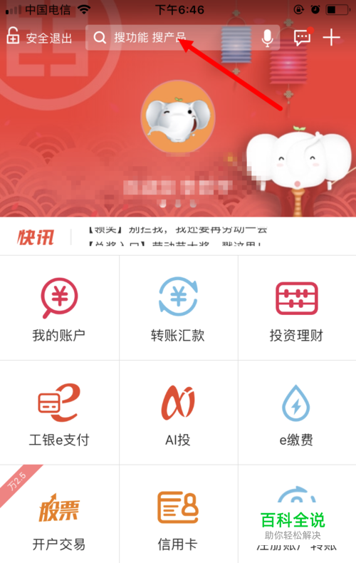 首先在手机上打开并登录工商银行App,接着点击首页面最上端的搜索栏。