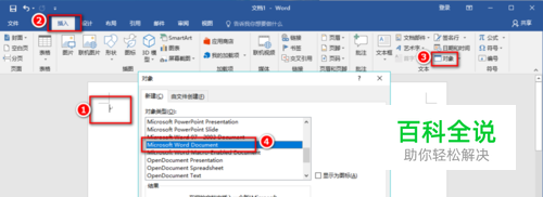 用鼠标点击需要插入附件的地方,依次点击“插入”——“对象”,在“新建”下选择合适的文档,如word、excel、PPT等。用这种方式可以添加空文档为附件。