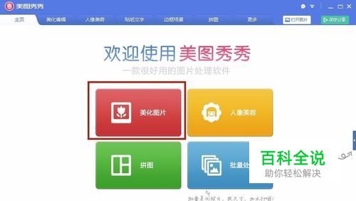 打开“美图秀秀”,点击“打开图片”,这里选择一个后缀为”jpg”图片文件。