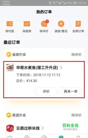 第一步在我们的手机中打开美团,点击底部的订单,选择要申请退款的外卖订单点击进去,如下图所示:
