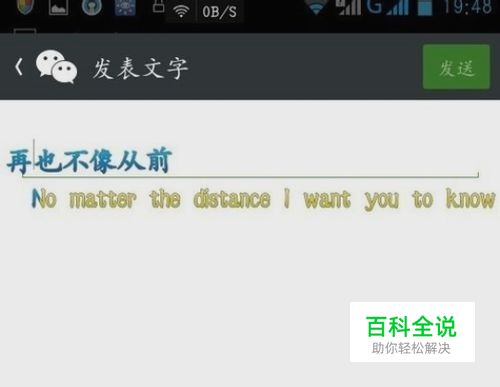 在文字编辑栏输入需要发布的文字内容,可独具匠心的设计你要发表的内容,因为没有图片进行装饰,所以文字的灵动要别具匠心,要能出彩 点击发送即可将微信文字心情发布至朋友圈供好友查看