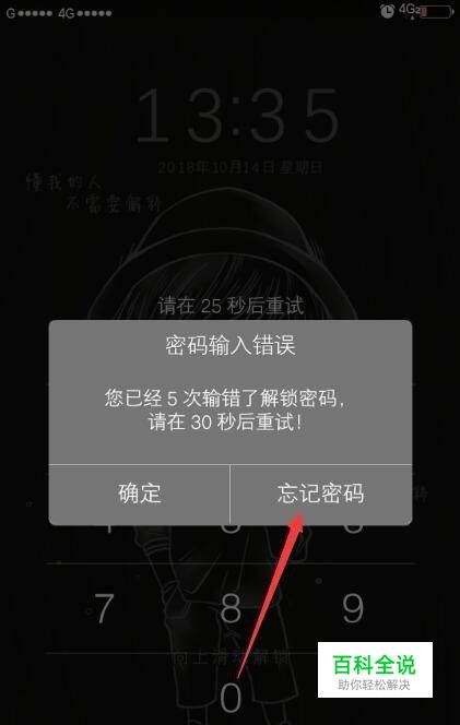 提示输入密码才可以进入到桌面,如果忘记解锁密码,我们就一直输入直到弹出下图提示停下,小编测试需要输入5次错的密码才会弹出提示,然后点击忘记密码。