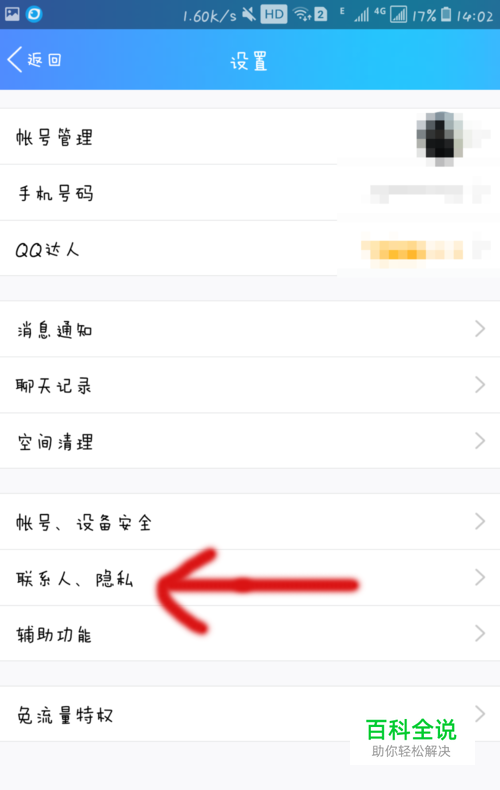 然后我们在设置界面中点击“联系人、隐私”,进入联系人、隐私设置界面。
