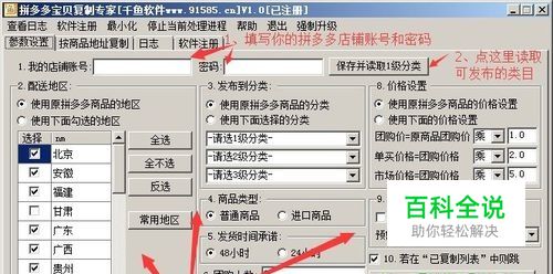 首先双击打开软件,填写你的拼多多账号和密码,点击“保存并读取一级分类”,设置要上传的商品的参数。