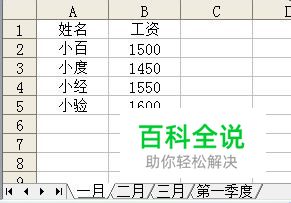 如图:将“一月”、“二月”、“三月”三个工作表中的“工资“列数据相加,汇总到第四个工作表“第一季度”中。