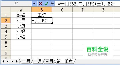 在“第一季度”工作表中,选择B2单元格,输入“=一月!B2+二月!B2+三月!B2”,按回车确认。 公式表示:“一月”工作表的B2单元格内的数值+“二月”工作表的B2单元格内的数值+“三月”工作表的B2单元格内的数值 引用其他工作表的数据,格式为:工作表名称!单元格地址