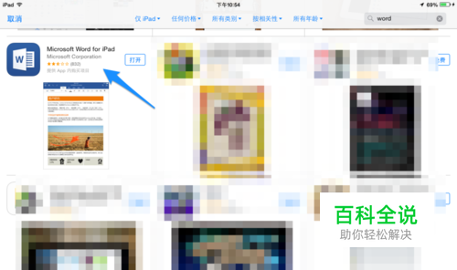 我们可以在 iPad 上的 App Store 应用商店中搜索 Word、Excel、PowerPoint 关键字,可以在列表中找到并免费下载。